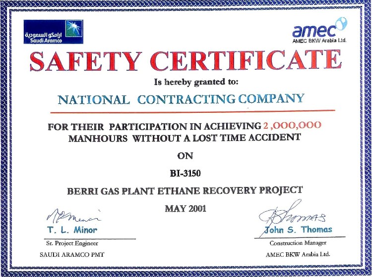 Saudi Electricity Co., in the eastern region (formerly known as Saudi Consolidated Electric Co.), awarded NCC the Safety Certificate for attaining the performance level of Category A on safety management during the construction of the 230/115kV transmission lines to Mahasen BSP .